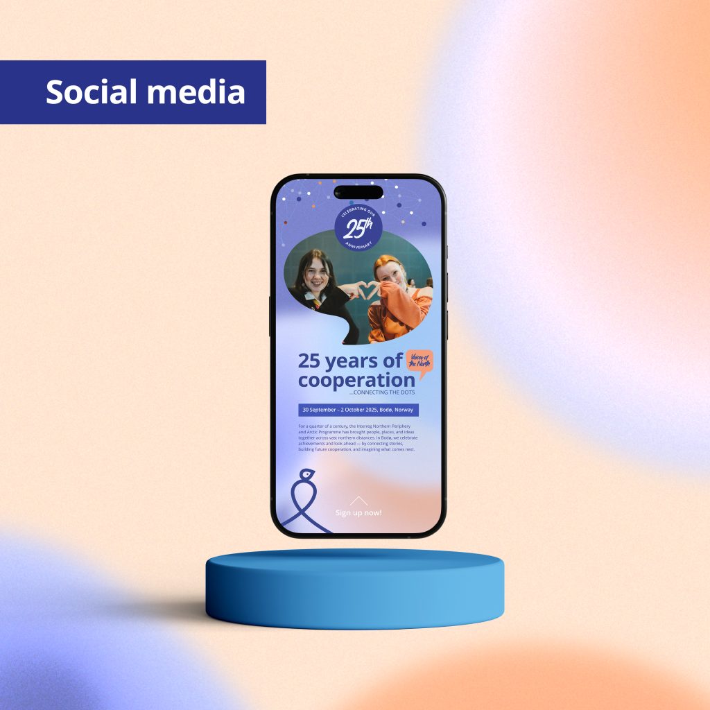 När Interreg NPA firade 25 år i Bodø fick vi uppdraget att skapa den visuella identiteten samt marknadsförings- och kommunikationsmaterial för jubileumskonferensen. Vi utvecklade en komplett grafisk profil med logoelement, färgpalett, slogan och mallar för presentationer, programblad, namnbrickor, banners, e-signaturer och sociala medier – allt för att ge eventet en tydlig och inspirerande helhet.