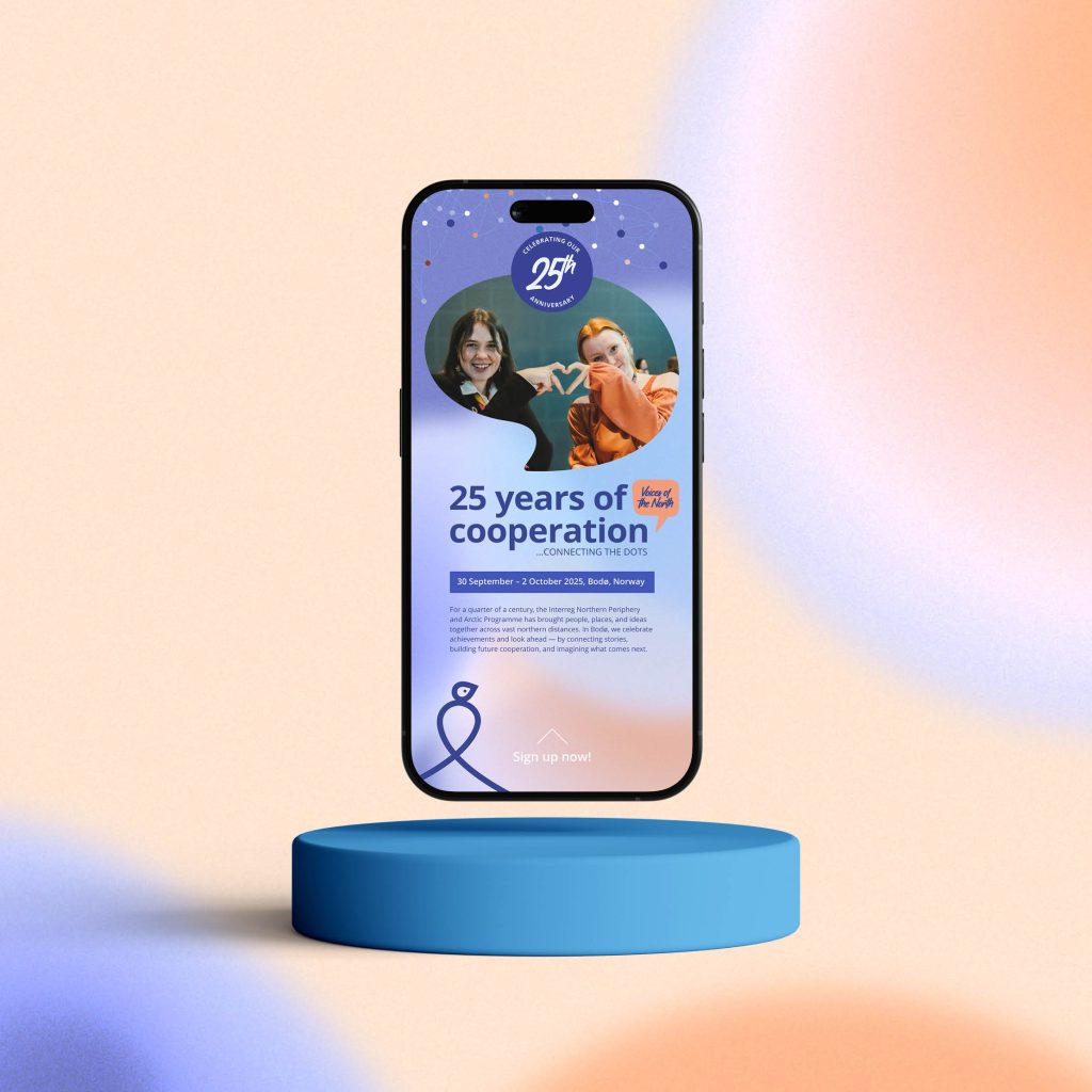 När Interreg NPA firade 25 år i Bodø fick vi uppdraget att skapa den visuella identiteten samt marknadsförings- och kommunikationsmaterial för jubileumskonferensen. Vi utvecklade en komplett grafisk profil med logoelement, färgpalett, slogan och mallar för presentationer, programblad, namnbrickor, banners, e-signaturer och sociala medier – allt för att ge eventet en tydlig och inspirerande helhet.