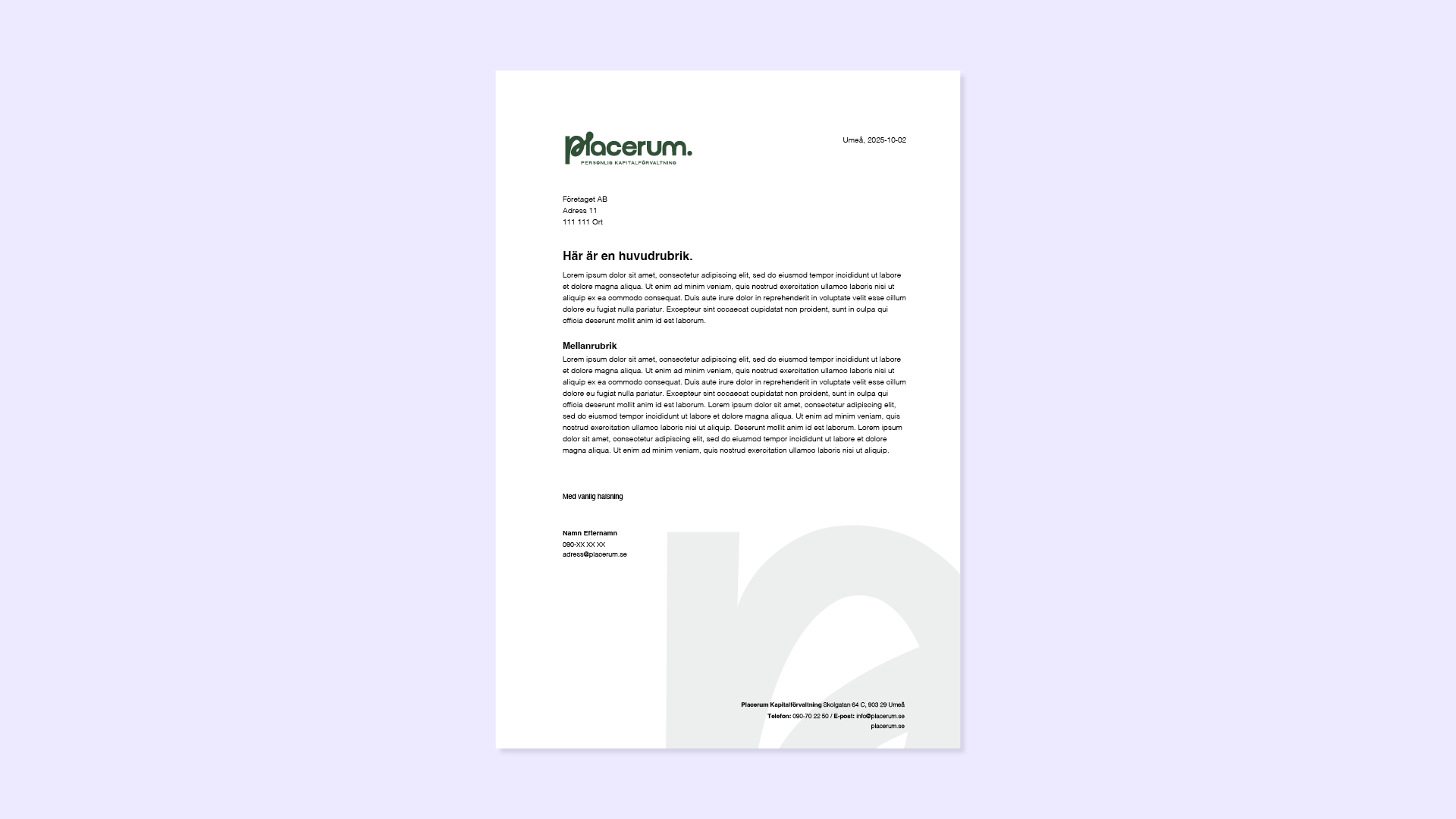 Den nya identiteten togs därefter ut i presentationer, lanseringsmaterial, trycksaker och digitala mallar – vilket gör profilen lätt att använda i alla delar av Placerums vardagliga kommunikation.