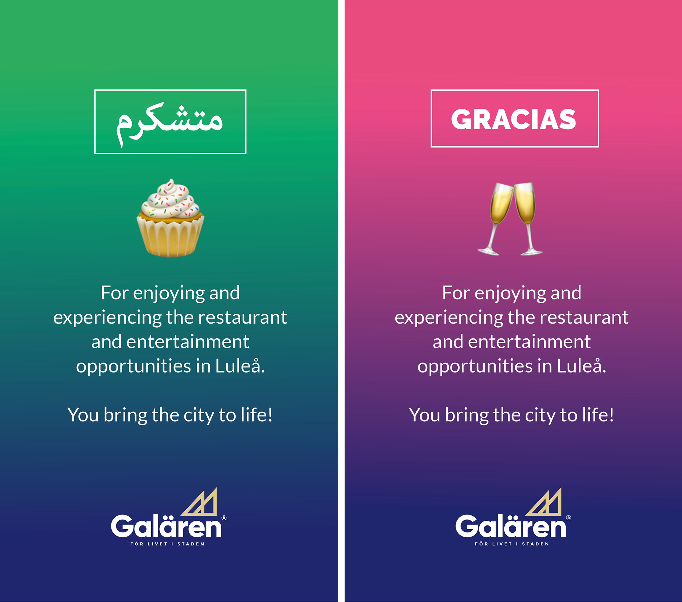 För att säkerställa att vi skulle nå väldigt många av Luleås invånare valde vi att skapa inkluderande tack-budskap på de språk som är mest representerade i Luleå. Dessa rullade som stories på både Instagram och Facebook.